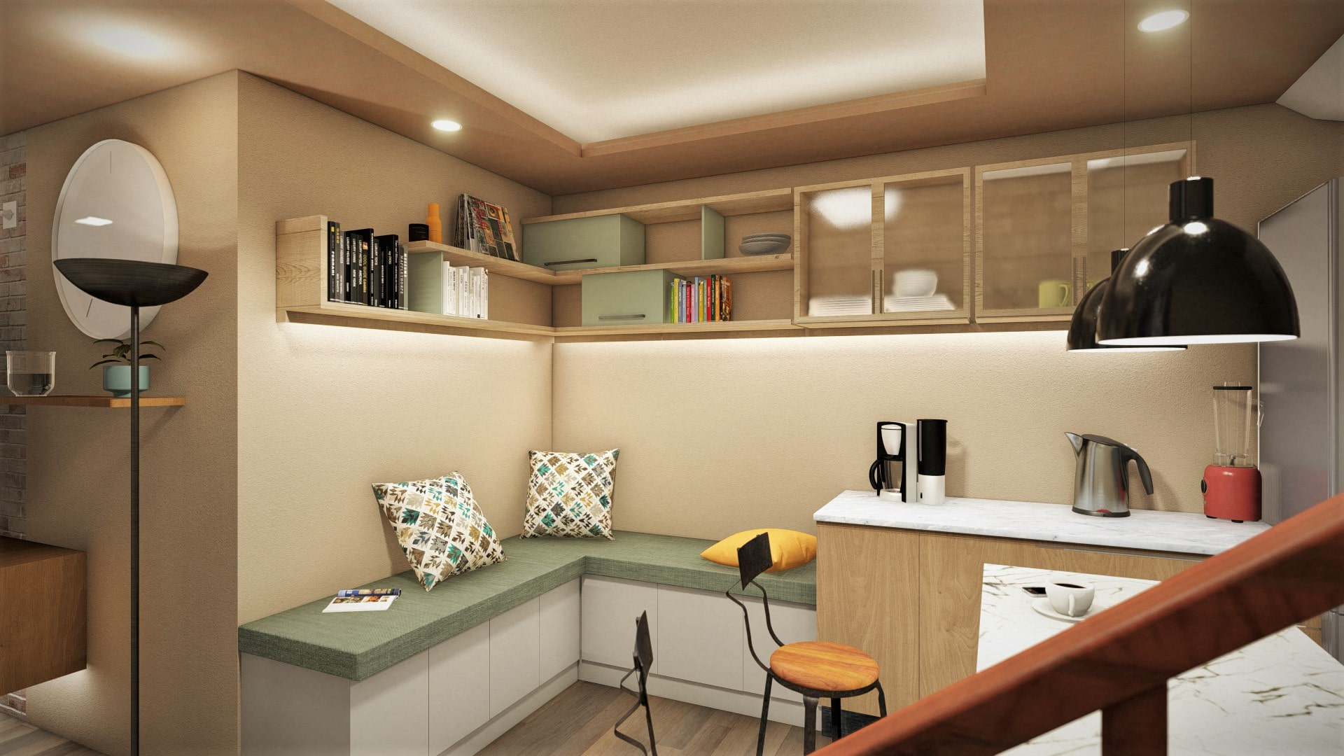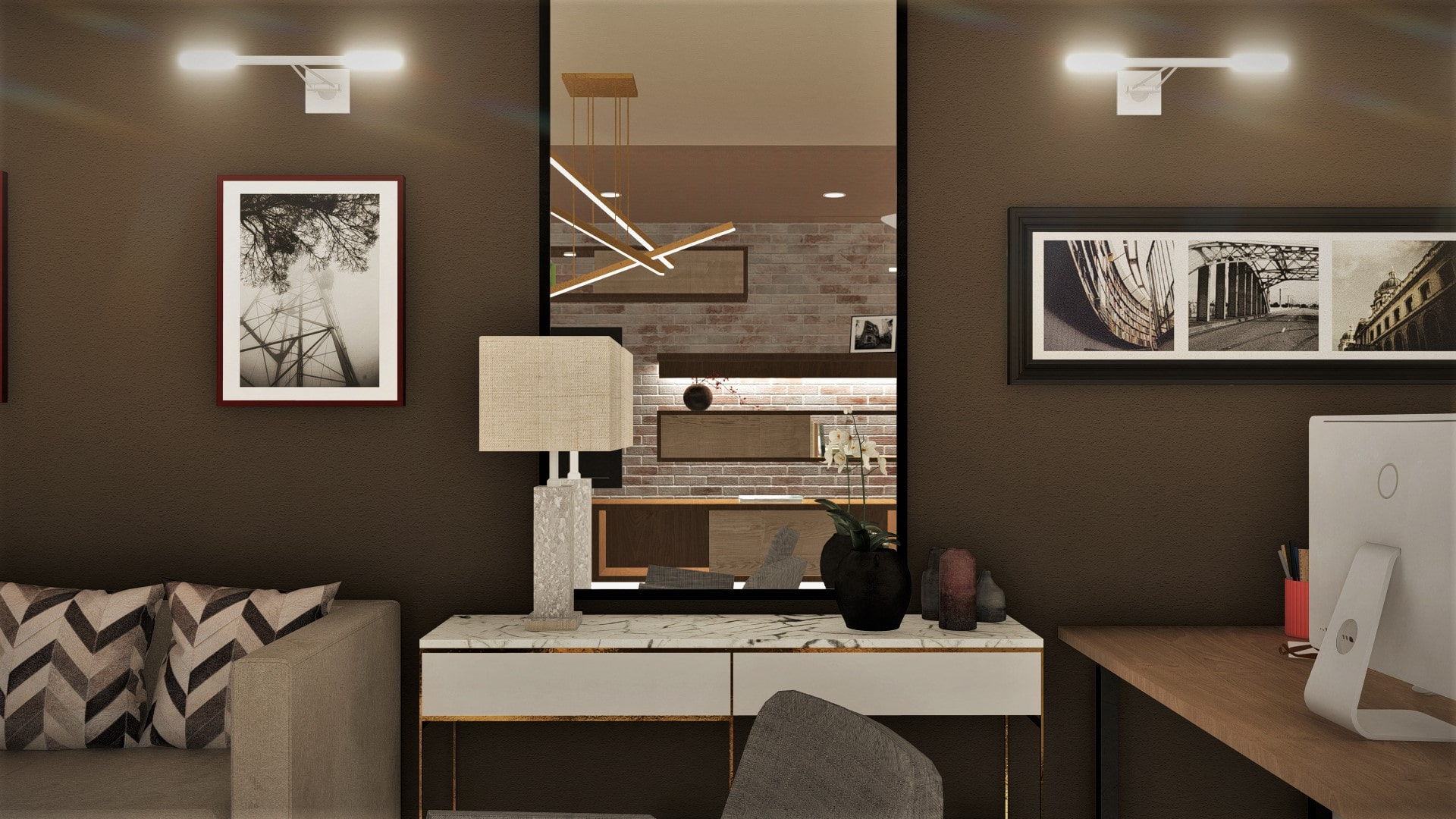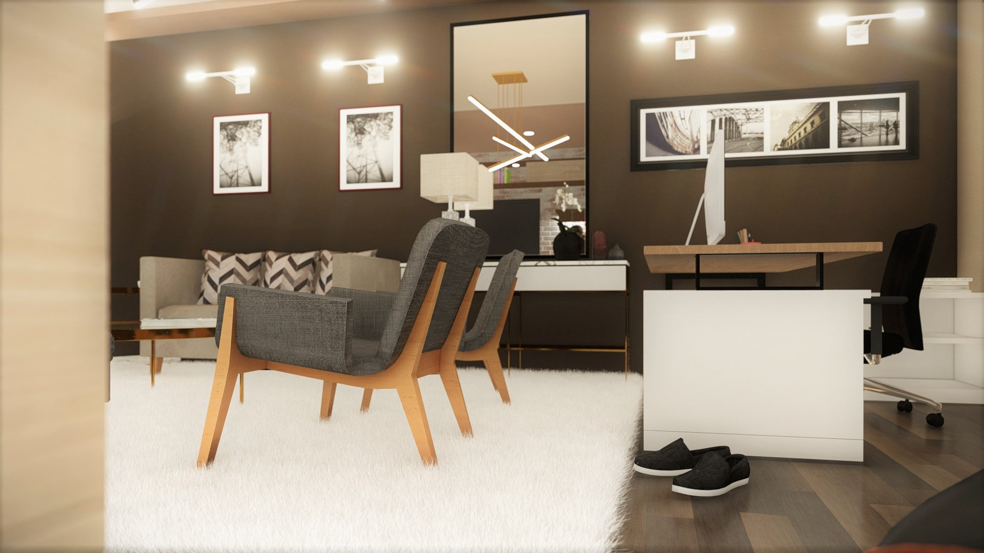A multi-functional basement integrates a moody, high-end lounge with a contemporary home office. Modern lighting and a rich color palette define the space, creating a refined atmosphere for both focused work and evening relaxation. By blending plush textures with minimalist decor, the design maximizes functionality without compromising its elegant, executive aesthetic.