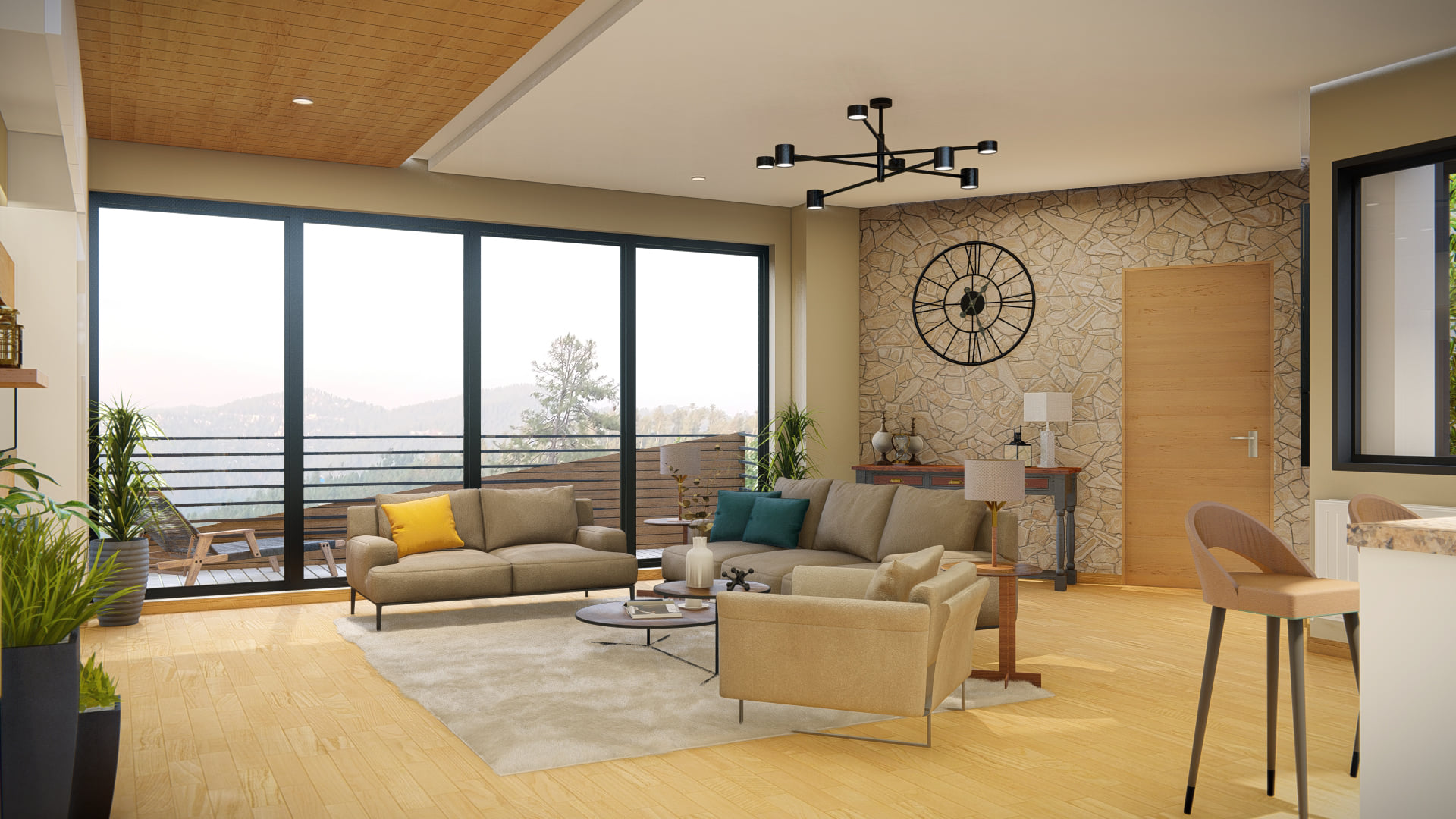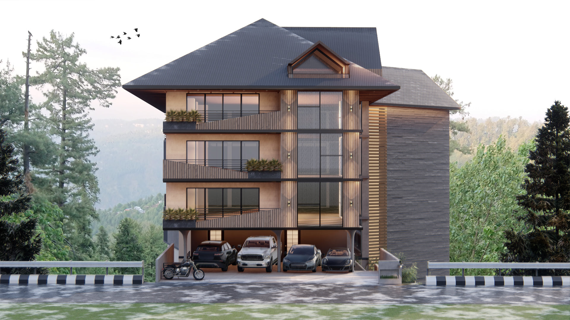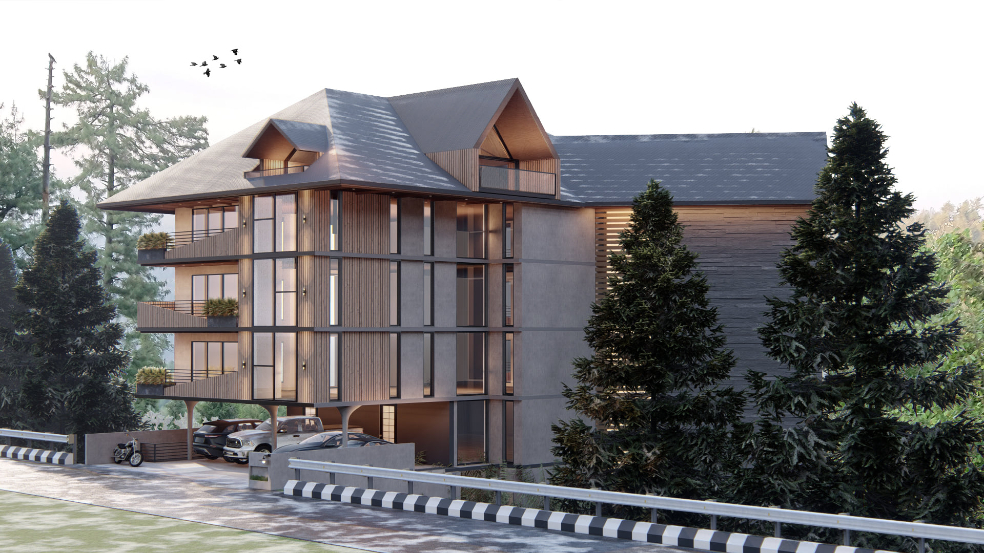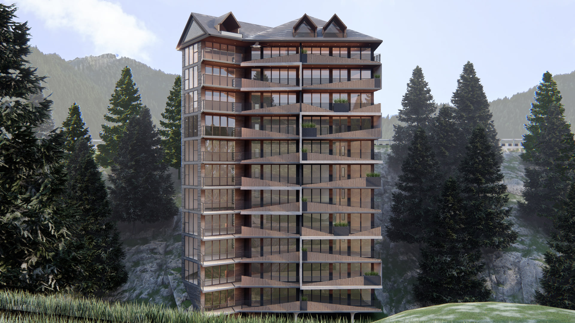 A rustic apartment building nestled on the side of a hill, the design takes into account the local weather conditions. The pitched roofs, recessed balconies, and humble profile all work together to make the building well-suited to its context. The interior features warm and modern tones along with clean lines, creating a blend of rustic and contemporary.