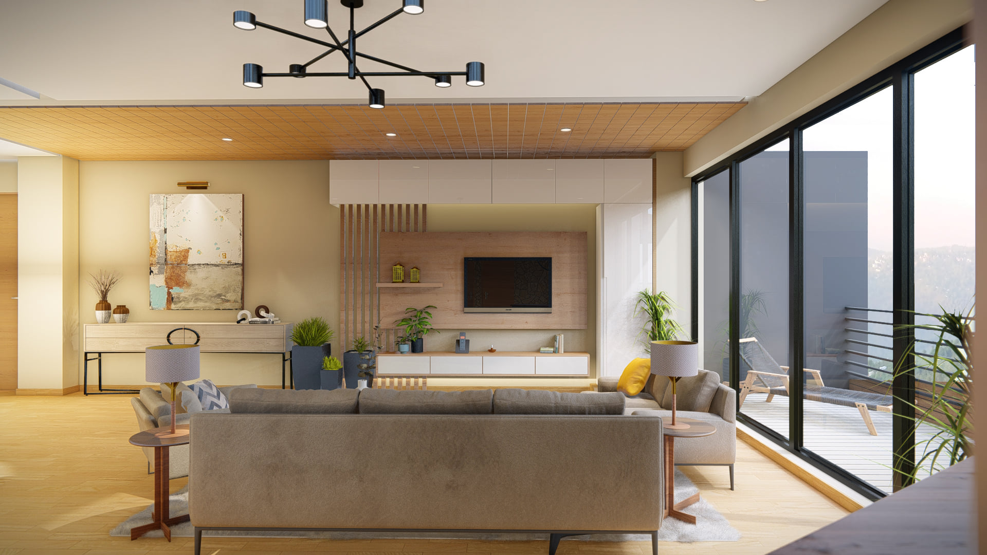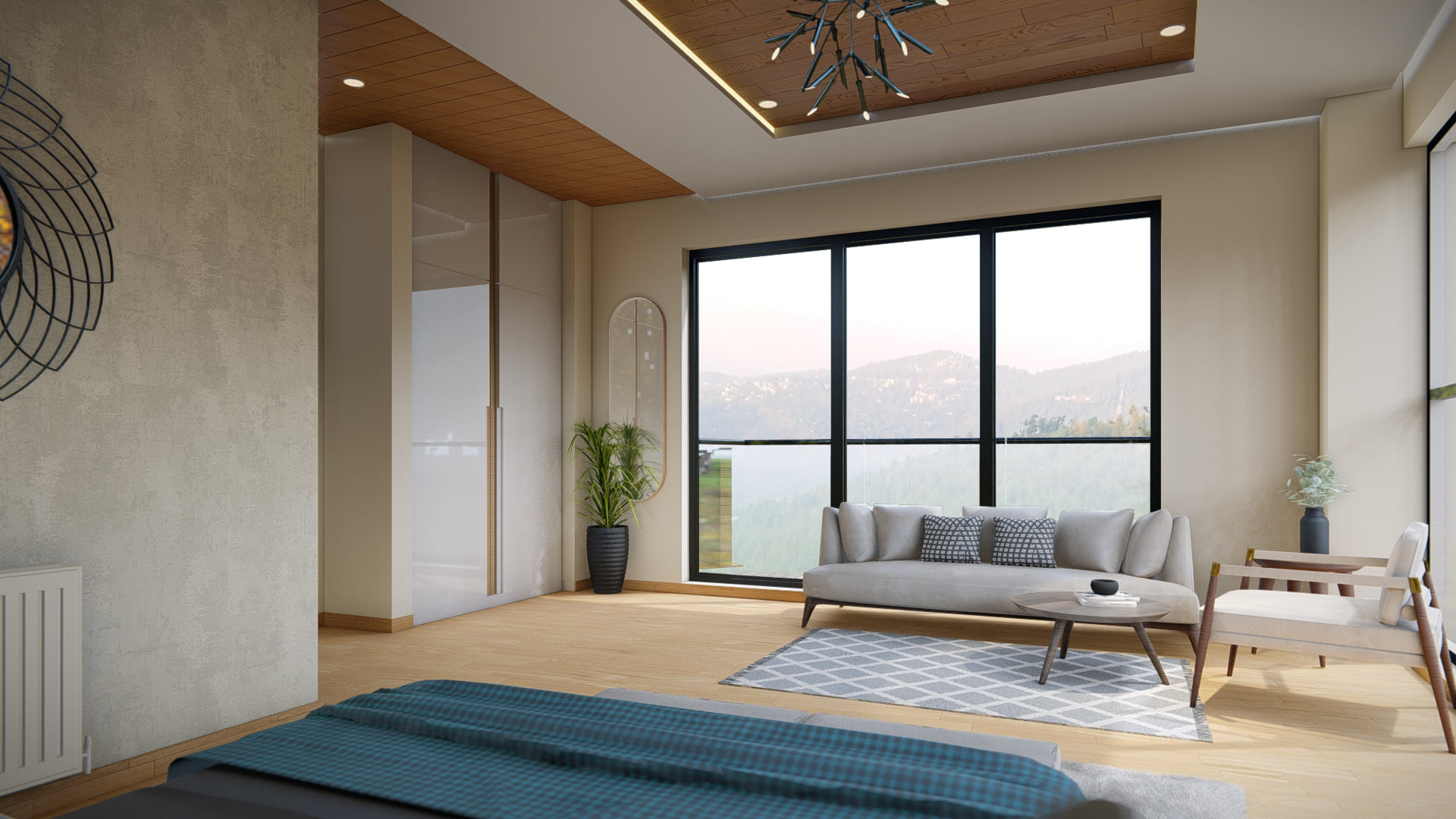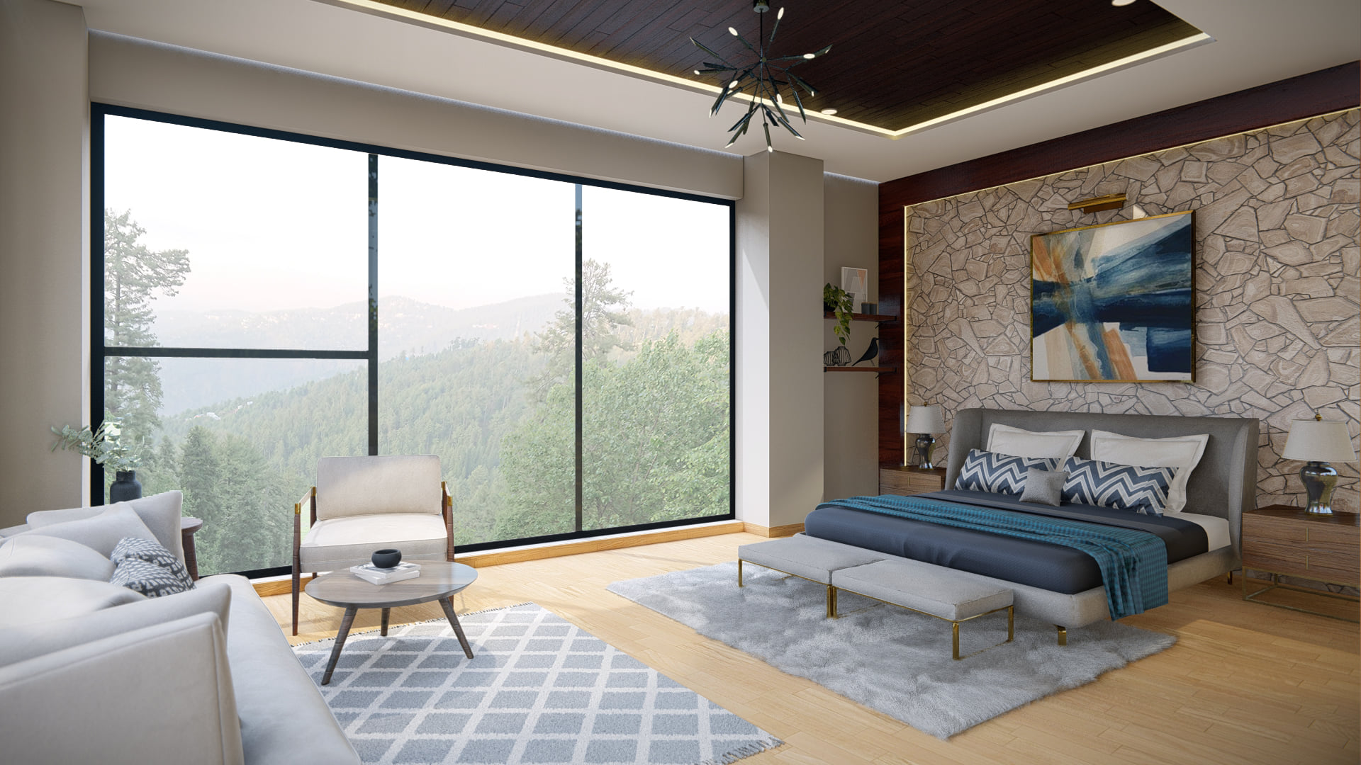A rustic apartment building nestled on the side of a hill, the design takes into account the local weather conditions. The pitched roofs, recessed balconies, and humble profile all work together to make the building well-suited to its context. The interior features warm and modern tones along with clean lines, creating a blend of rustic and contemporary.