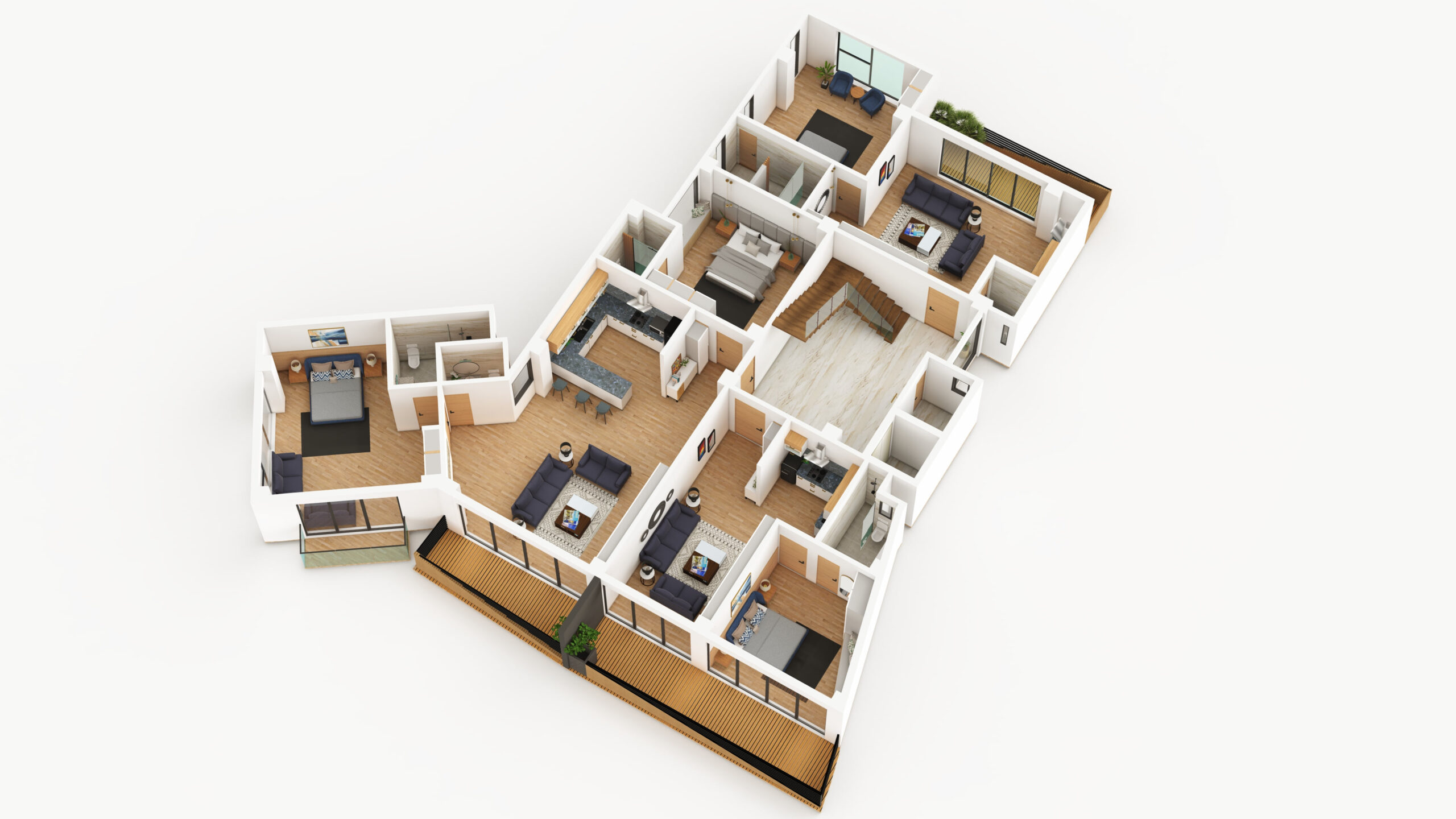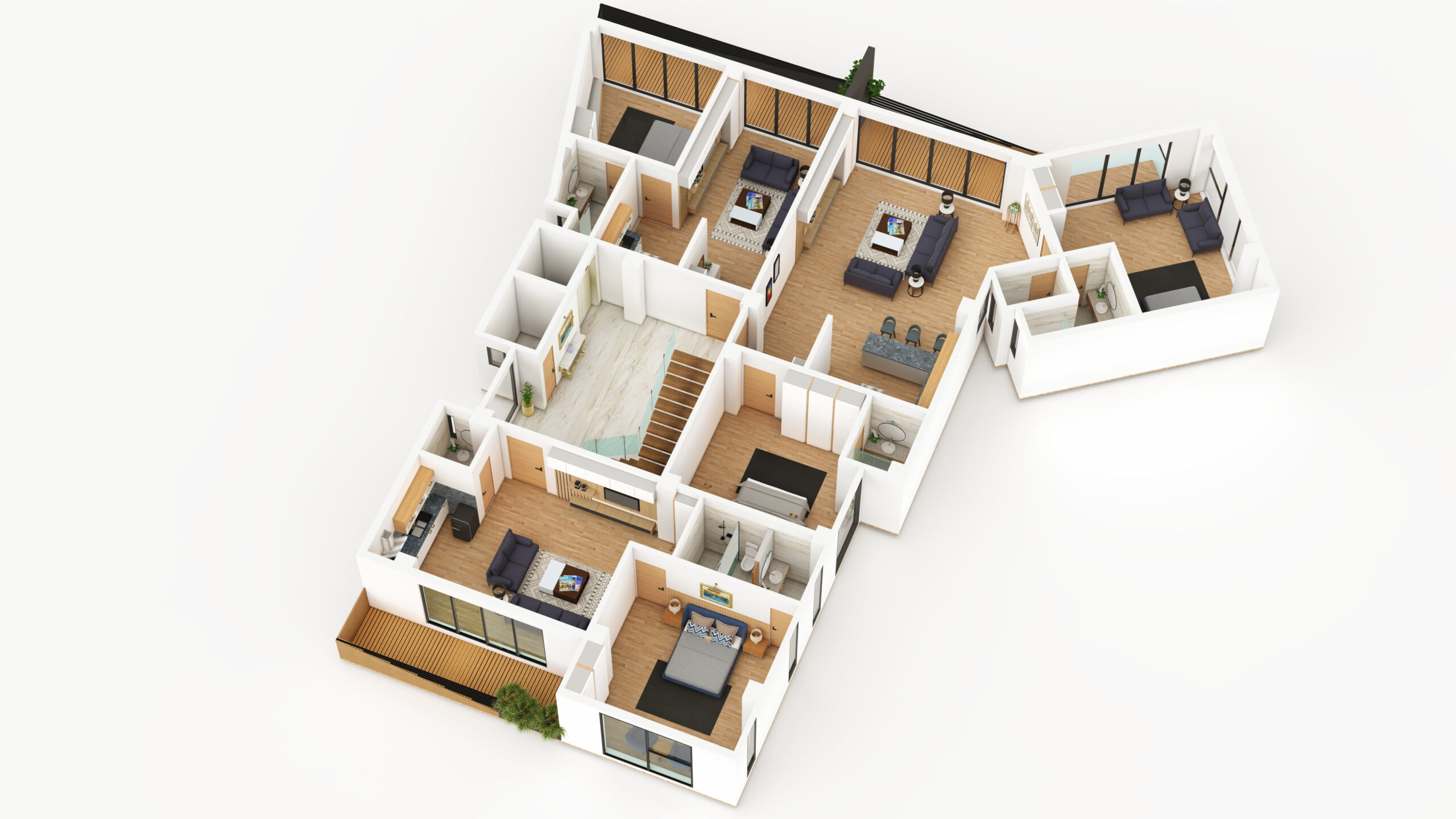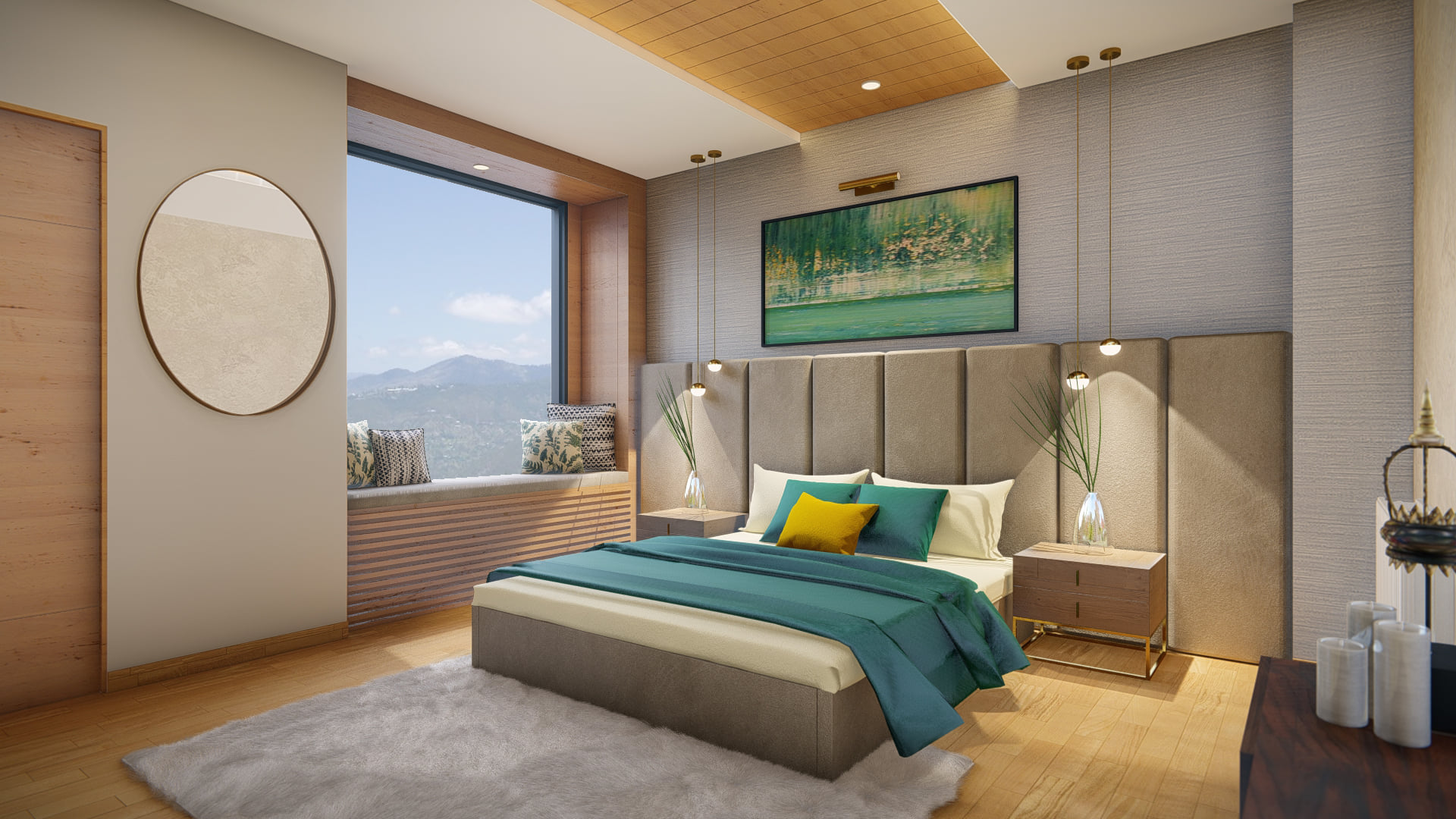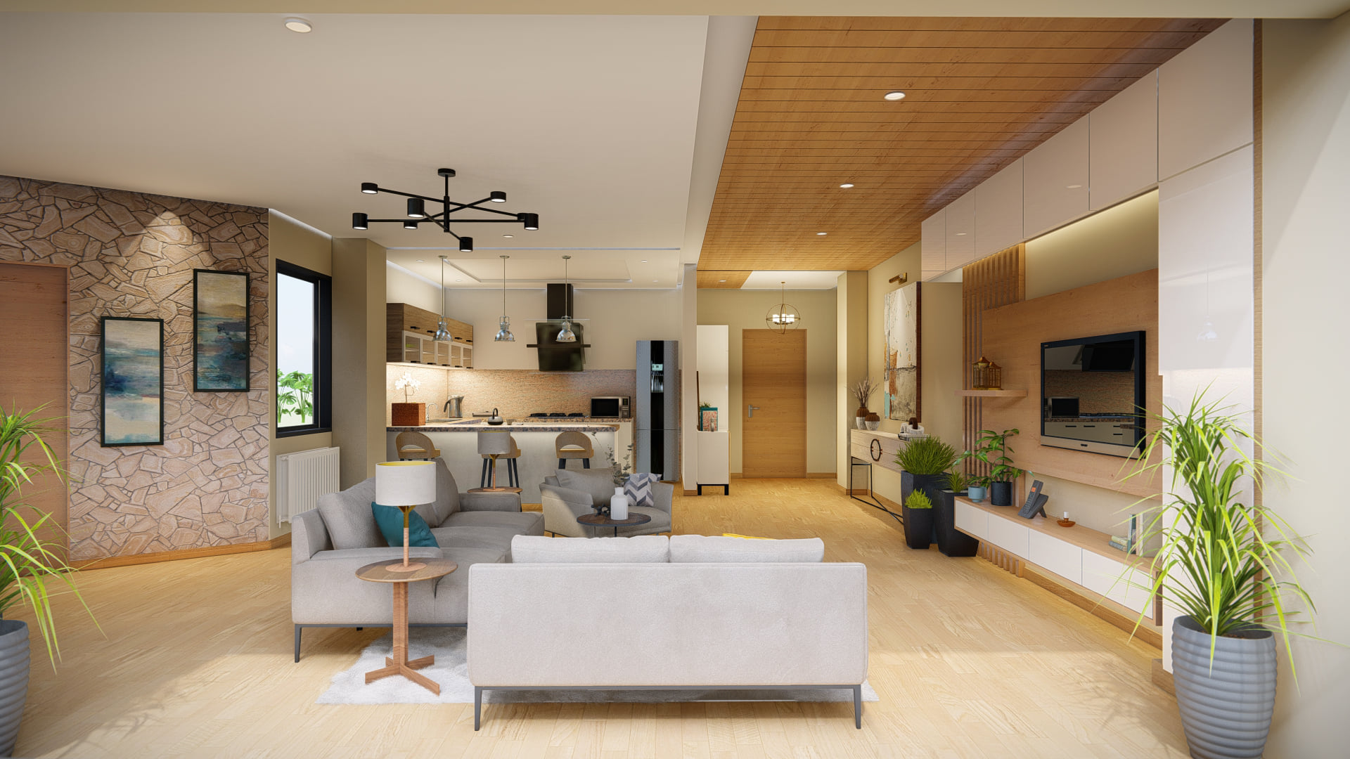 A rustic apartment building nestled on the side of a hill, the design takes into account the local weather conditions. The pitched roofs, recessed balconies, and humble profile all work together to make the building well-suited to its context. The interior features warm and modern tones along with clean lines, creating a blend of rustic and contemporary.