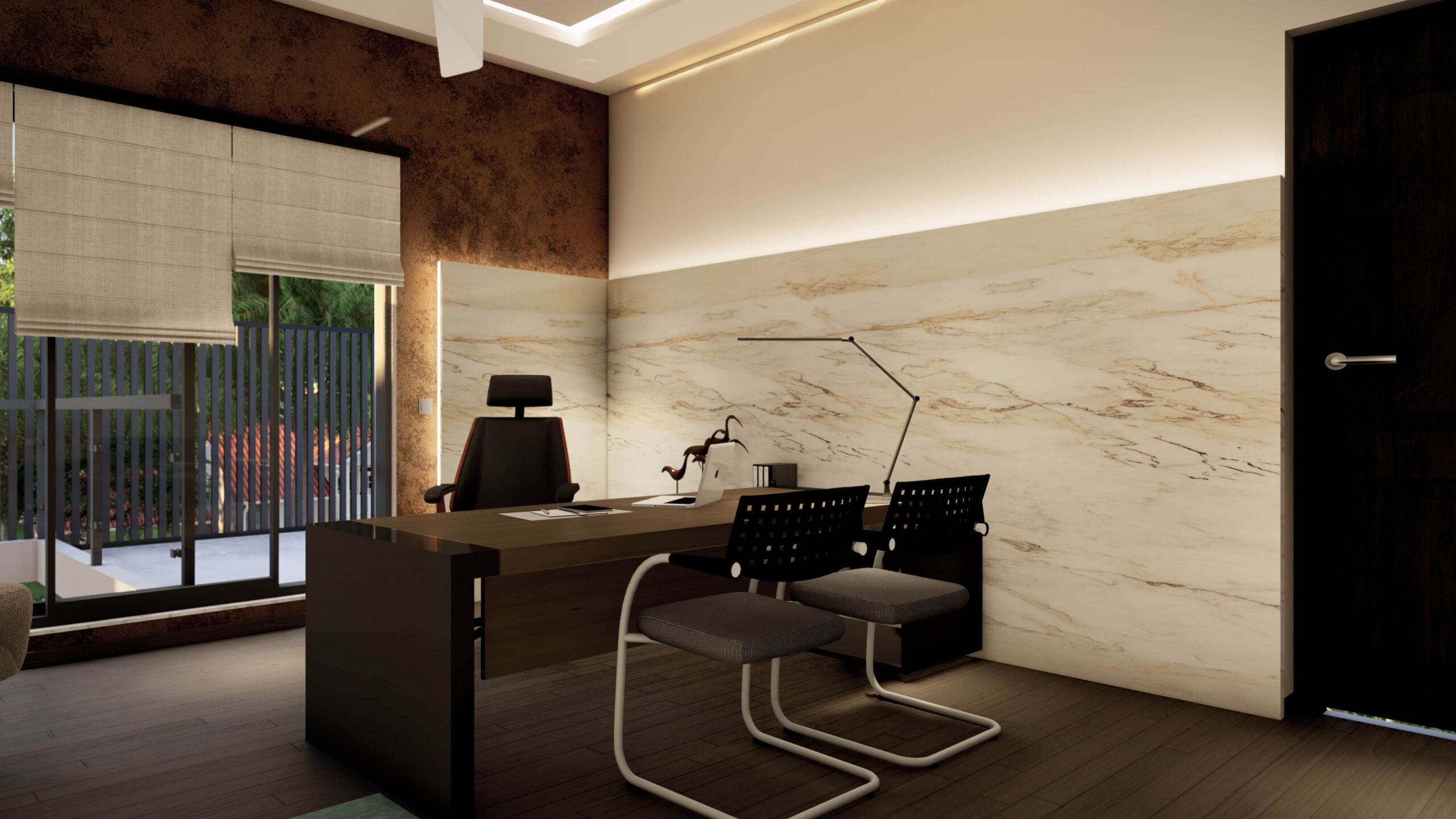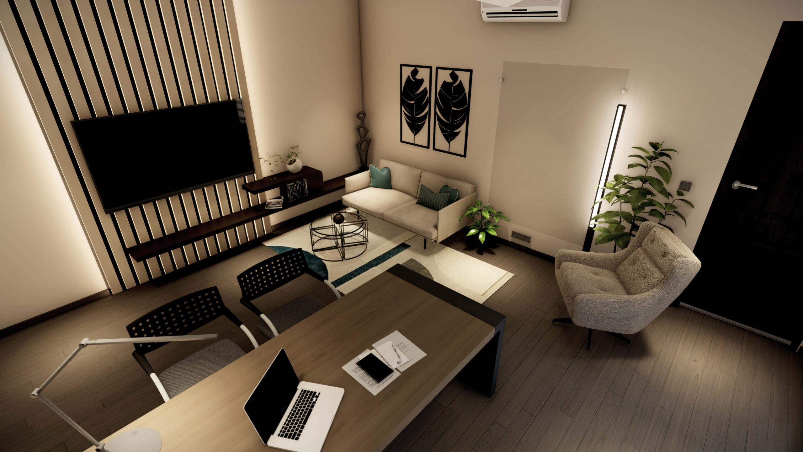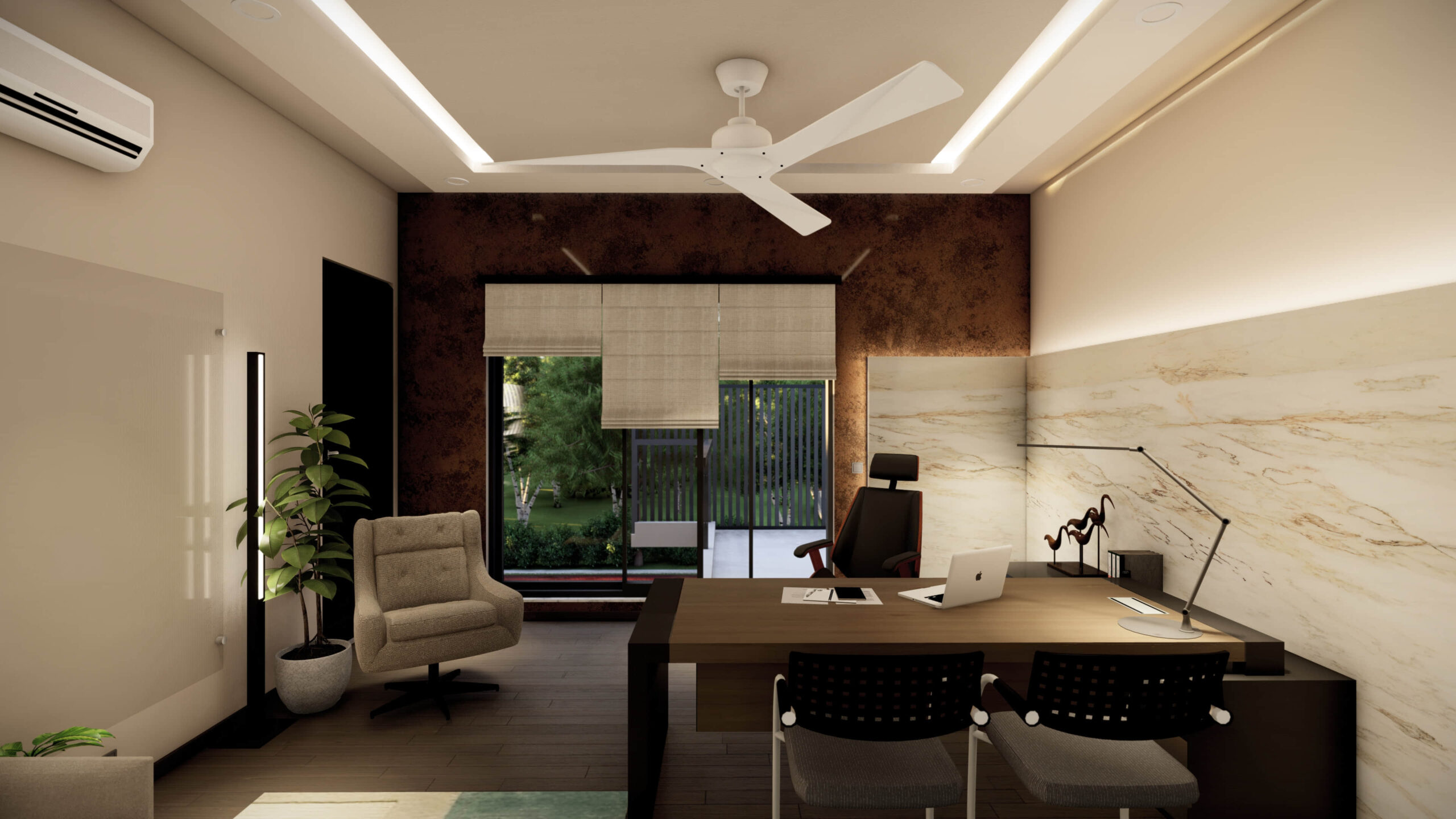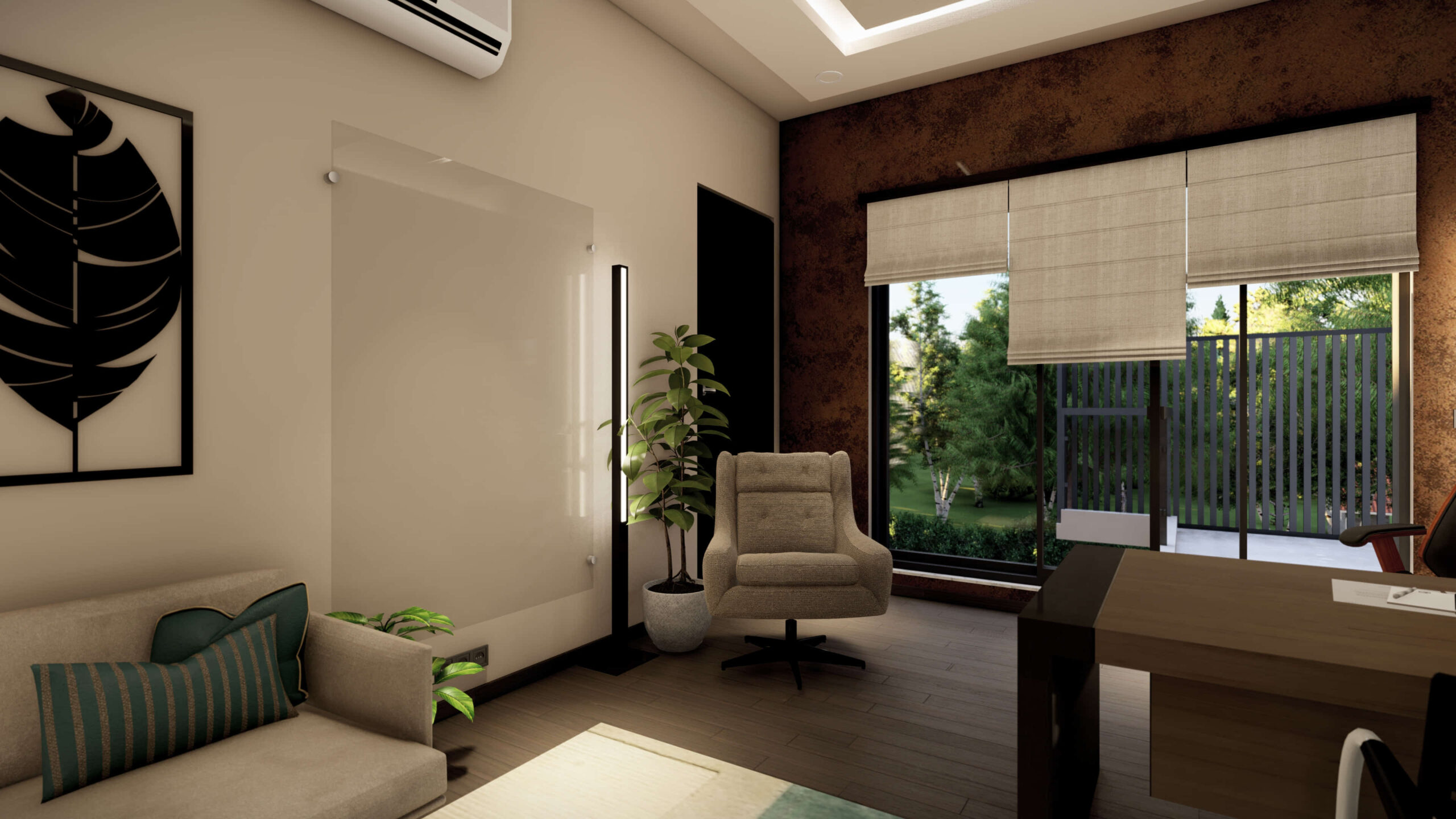 Description:A small private office space that’s designed with warm luxury in mind. The use of warm materials and color palettes, contrasted with neutral whites to create a sense of both openness and coziness.