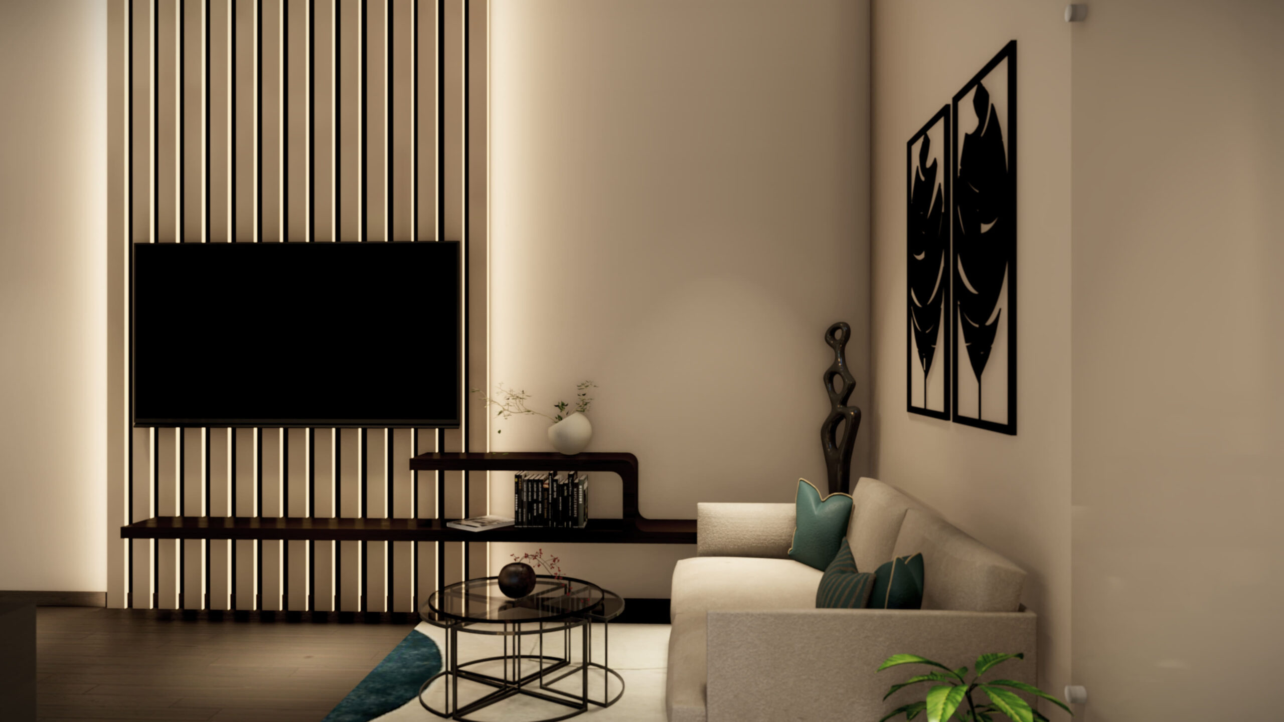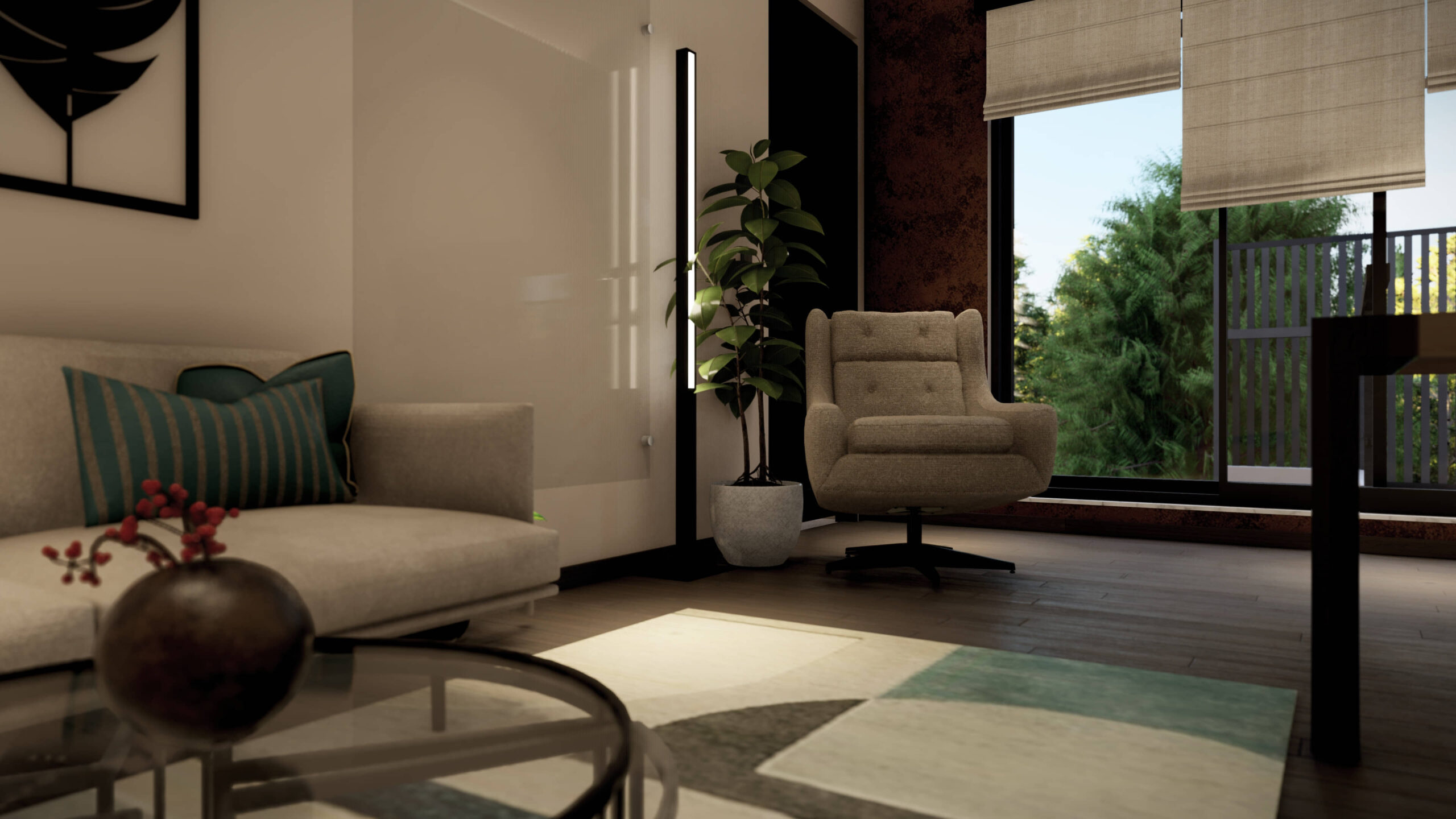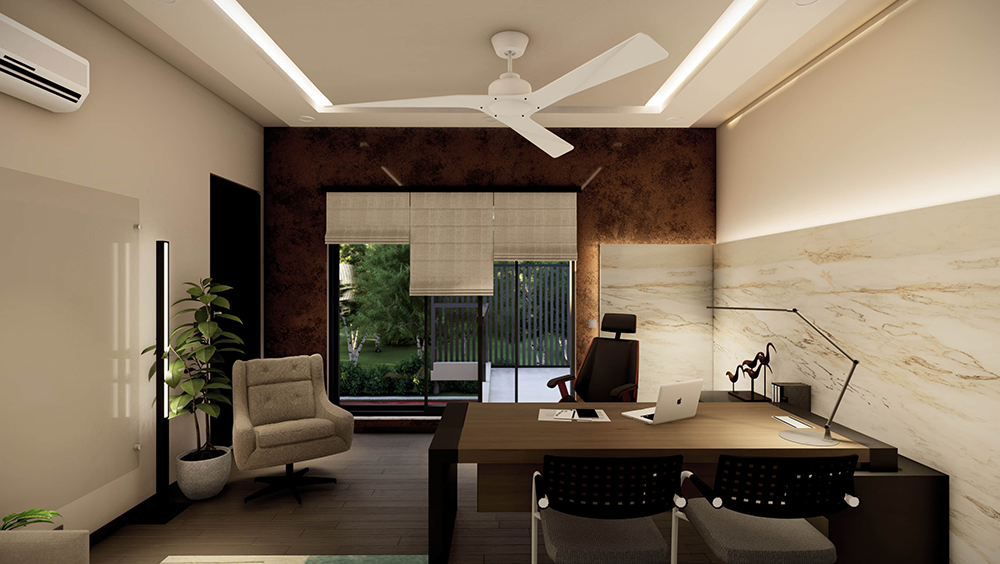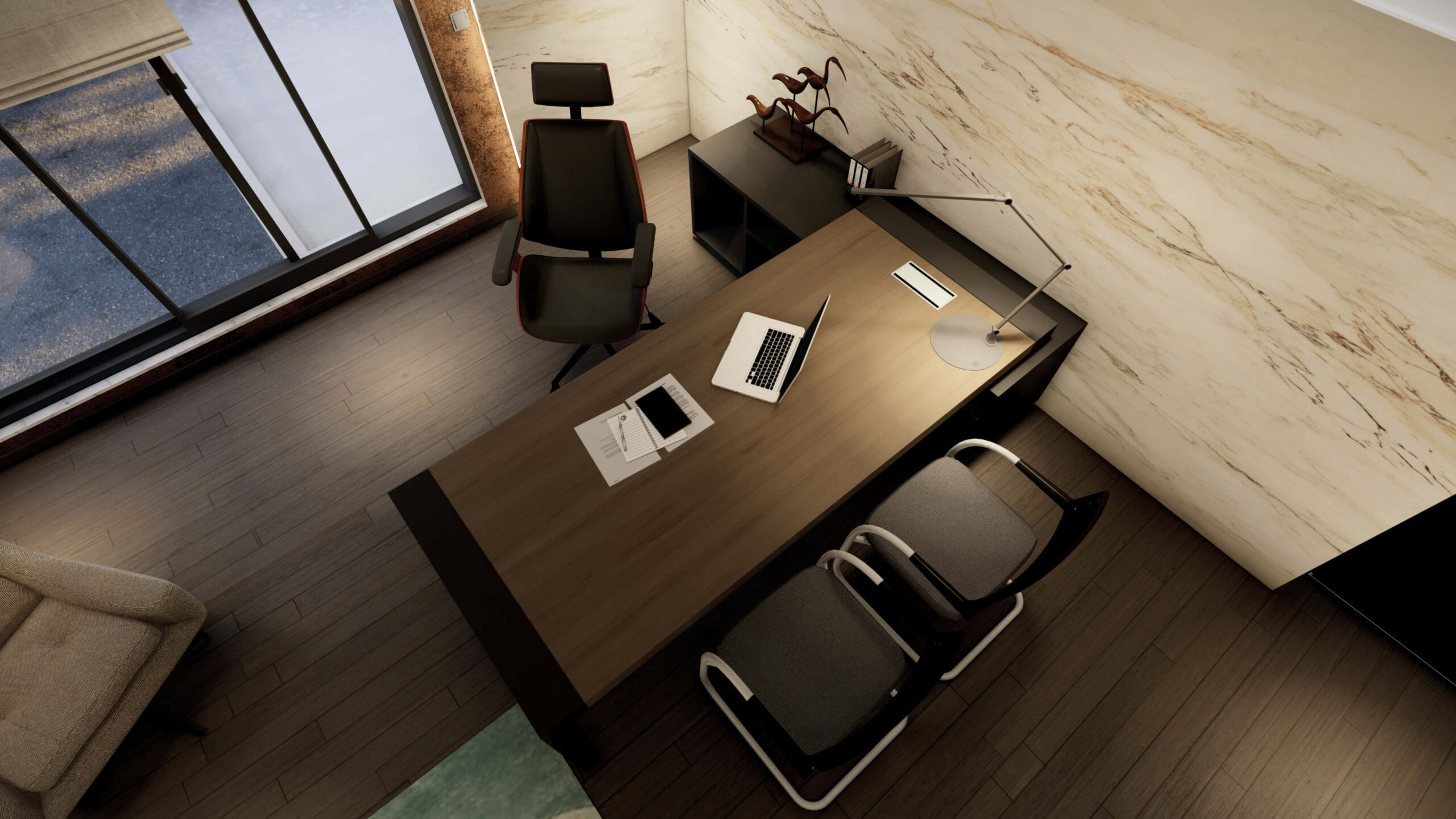 Description:A small private office space that’s designed with warm luxury in mind. The use of warm materials and color palettes, contrasted with neutral whites to create a sense of both openness and coziness.