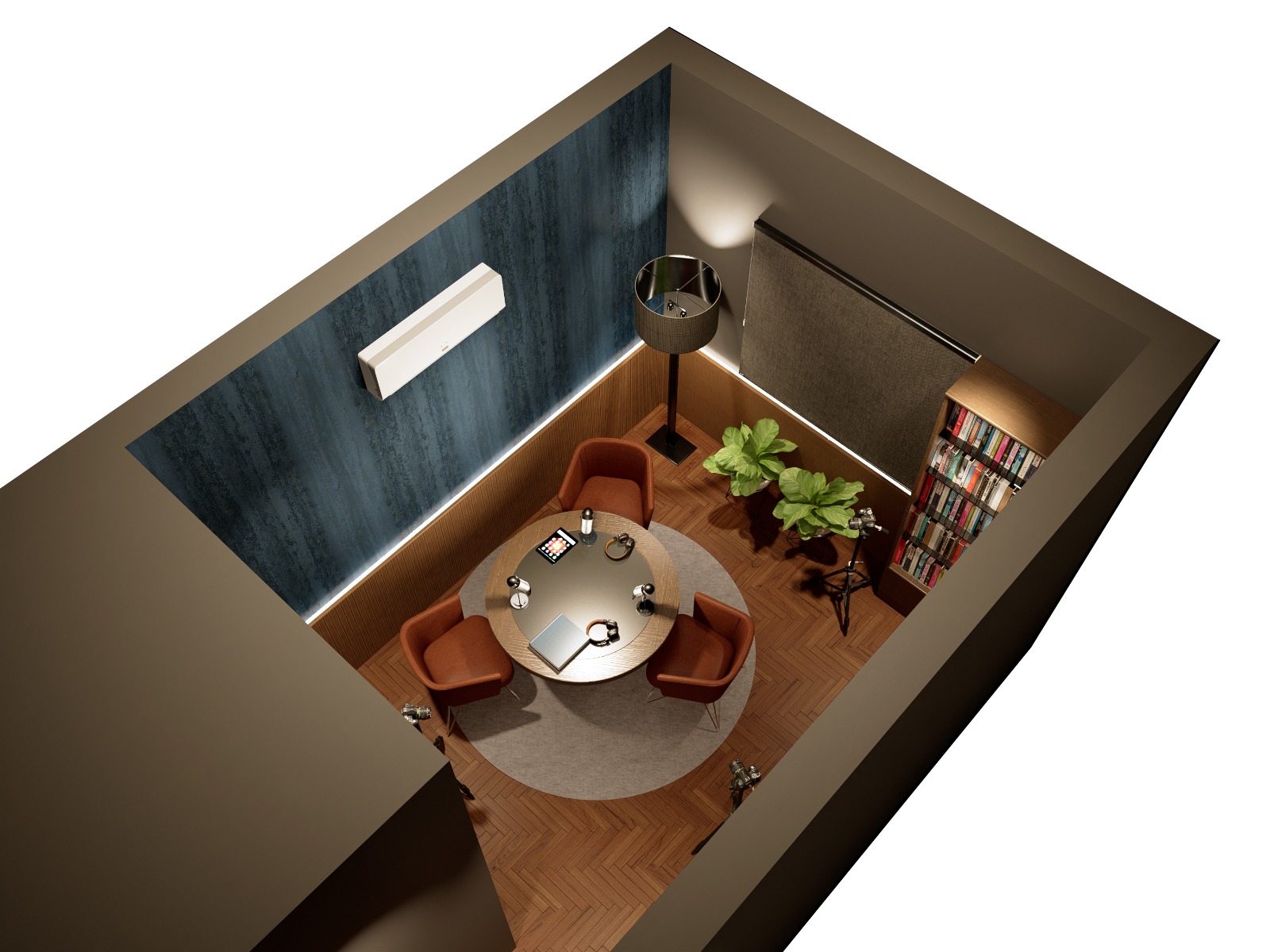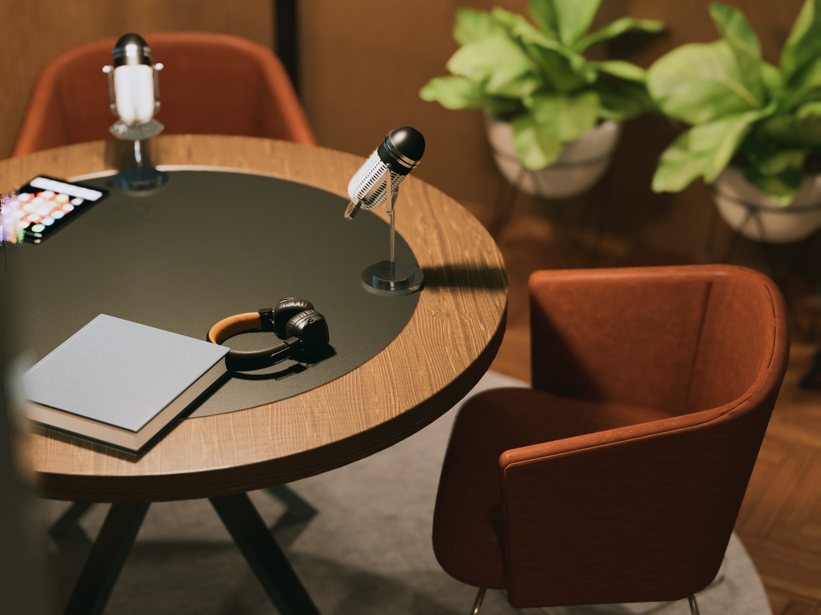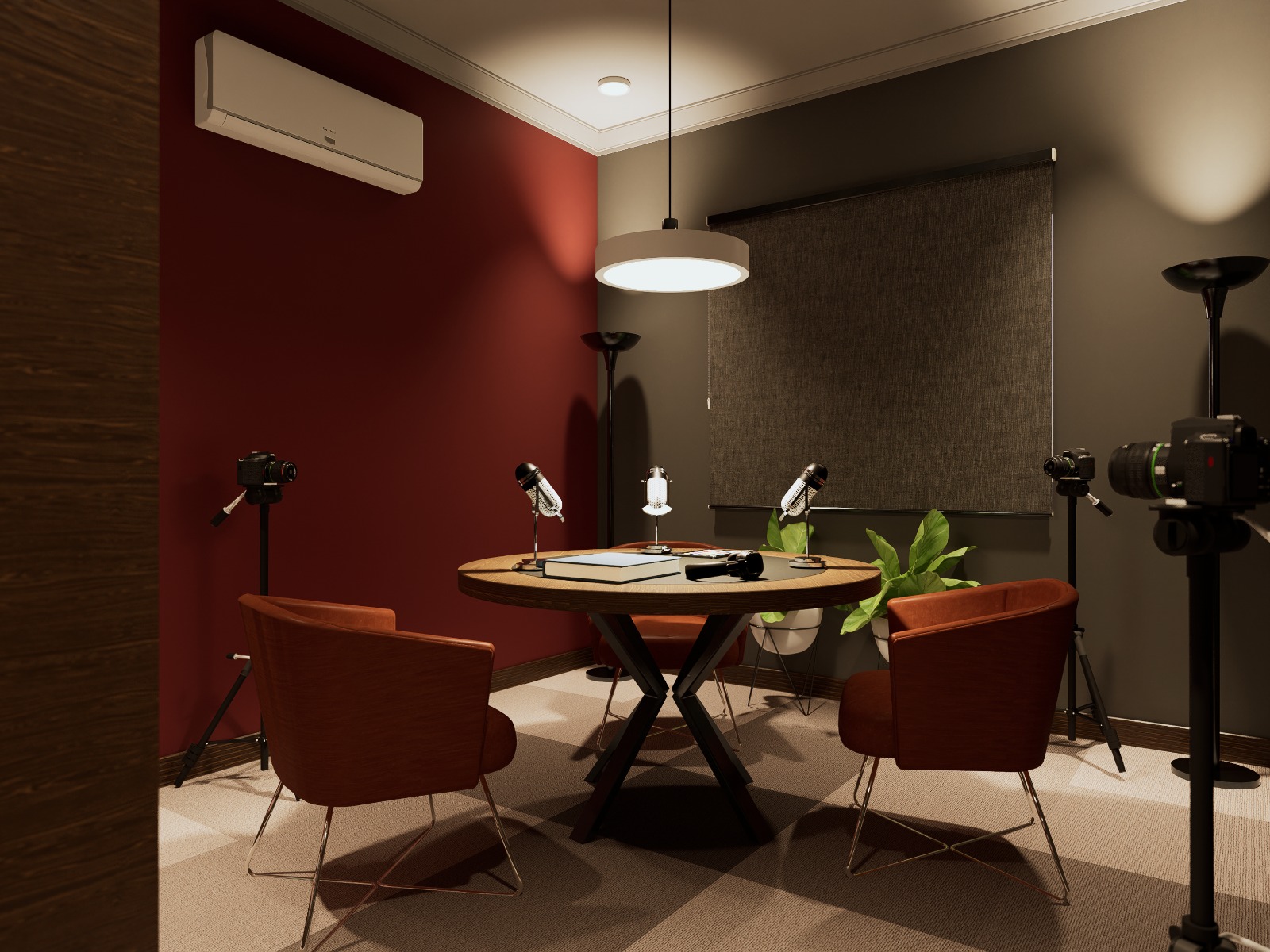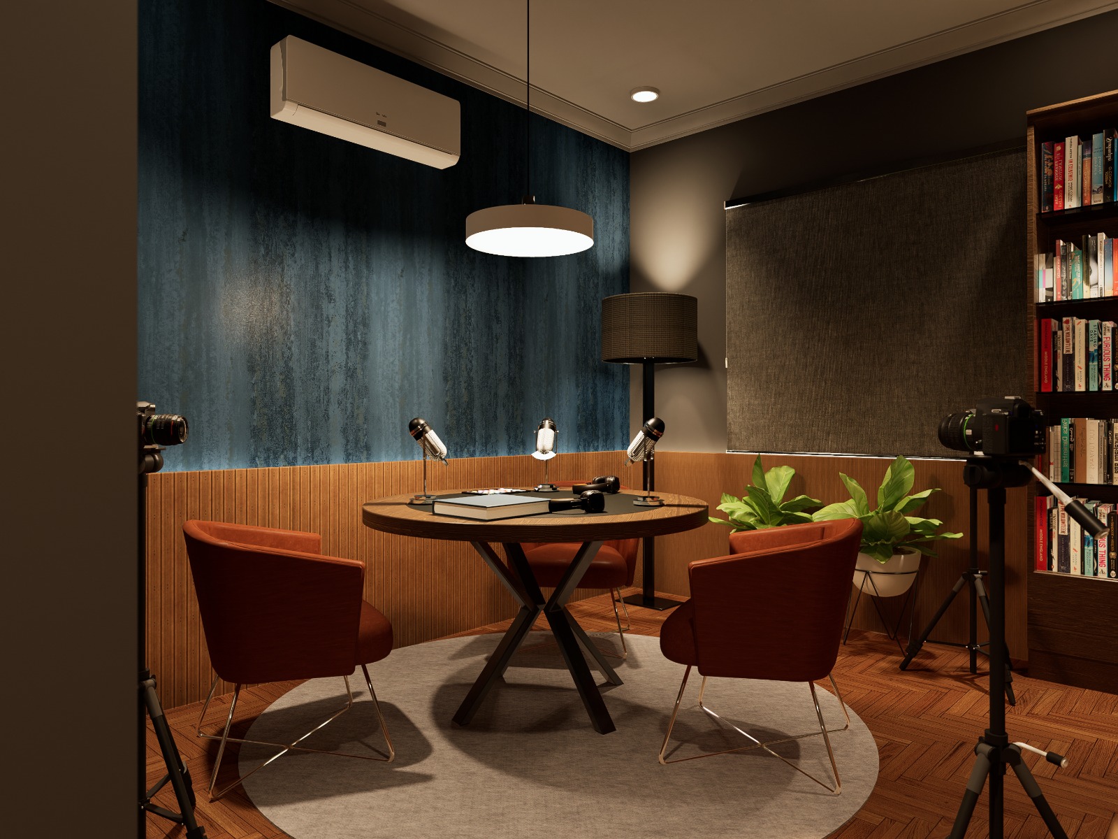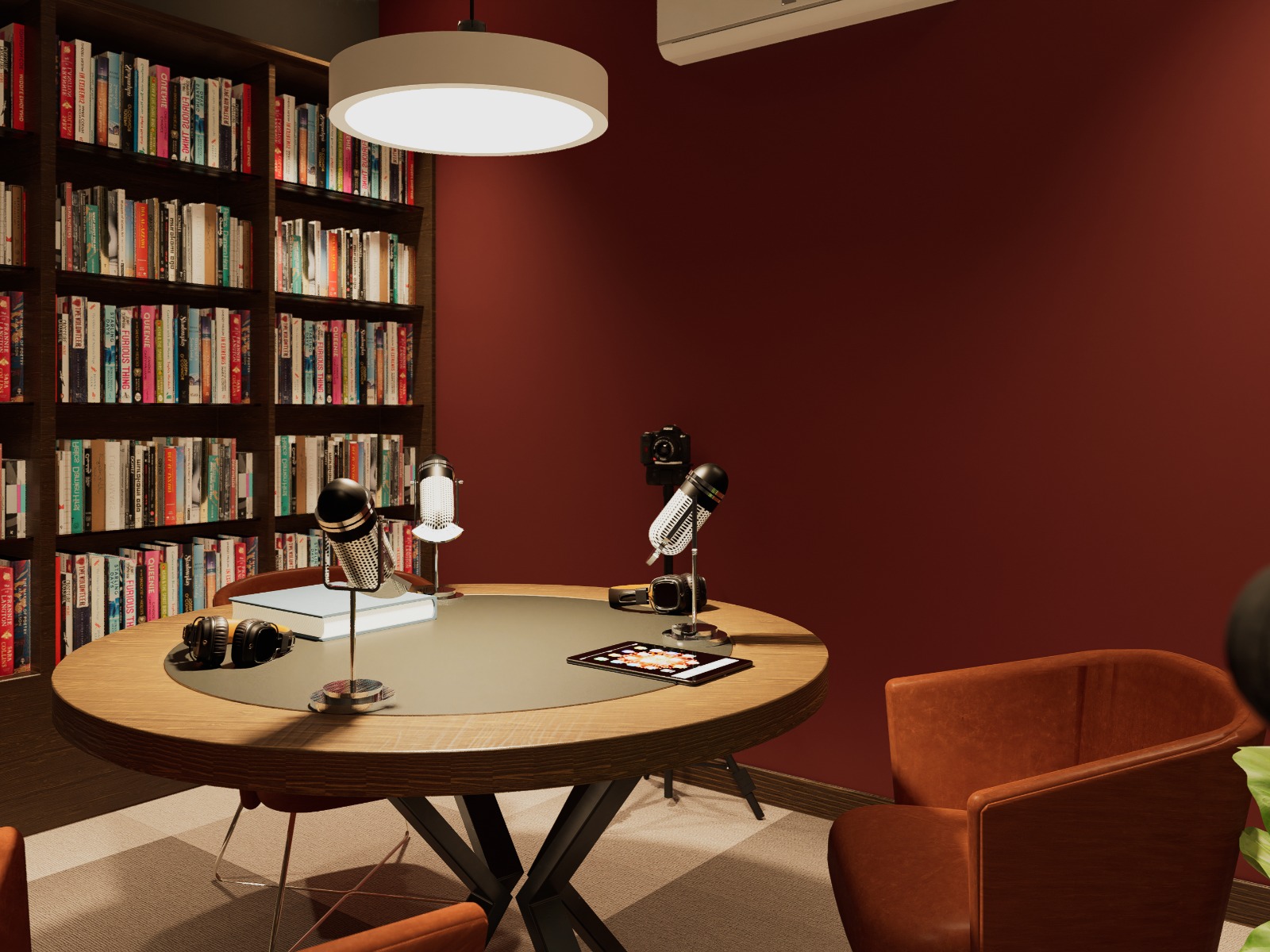 A small, intimate space designed with the sole purpose of hosting and recording podcasts. The design features flexible, yet comfortable furniture, materials like carpet and fabric panels for sound absorption, and different wall finishes, including a large bookcase, for a variety of possible backdrops.